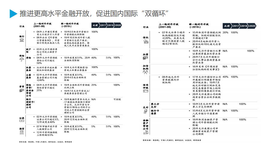➢ 与2001年加入WTO后的开放相比,此轮始于2018年的金融对外开放,无论在金融牌照开放广度、业务资质开放深度、还是开放速度上都超过了上一轮。