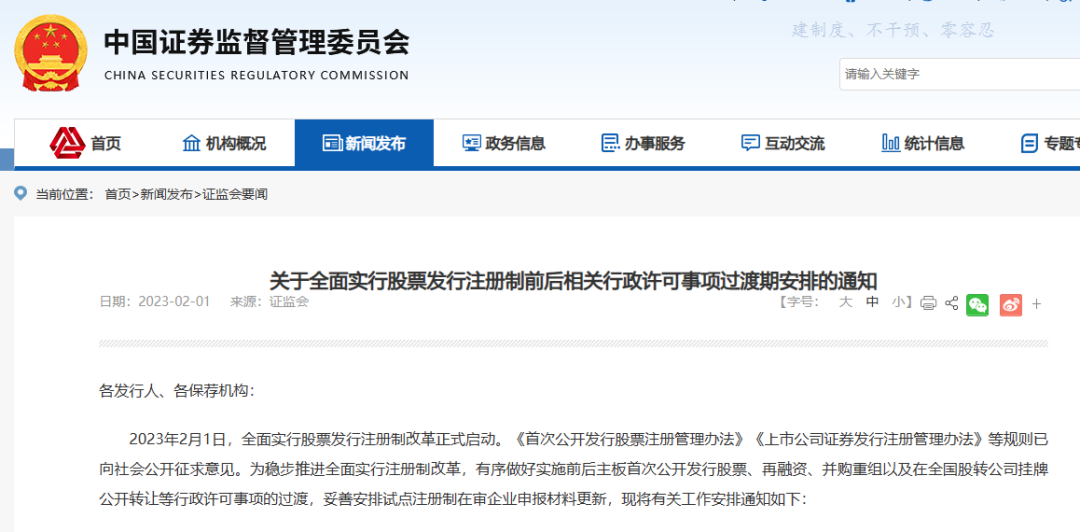 2月1日下午,据证监会网站消息,2023年2月1日,全面实行股票发行注册制改革正式启动。