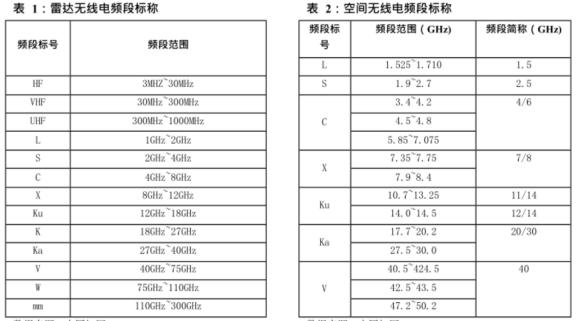卫星通信作为无线电通信形式的一种,信号的中转和传输也要依赖不同频段的无线电波。在地面雷达系统的应用中,虽然IEEE标准中将无线电波划分为VHF、UHF、L、S、C、X、Ku、Ka以及EHF等频段,但在实际应用当中,上述频带中仅有一小部分被分配给雷达应用,大部分频带由国际电联(ITU,InternationalTelecommunicationUnion)的世界无线电通信大会分配给空间无线电应用,雷达频段和空间无线电频段对应关系如下: