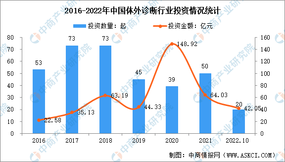 我国体外诊断行业投融资整体呈现波动趋势,由于2020年出现华大智造完成10亿美元B轮融资这样的超大额事件,再加上新冠疫情的推动,2020年投资金额达到历史最高,为148.92亿元。2021年,我国体外诊断行业投融资事件达50件,投融资金额达64.03亿元。2022年1-10月,行业投融资数量达20件,投资金额达42.05亿元。