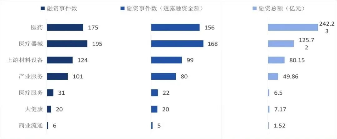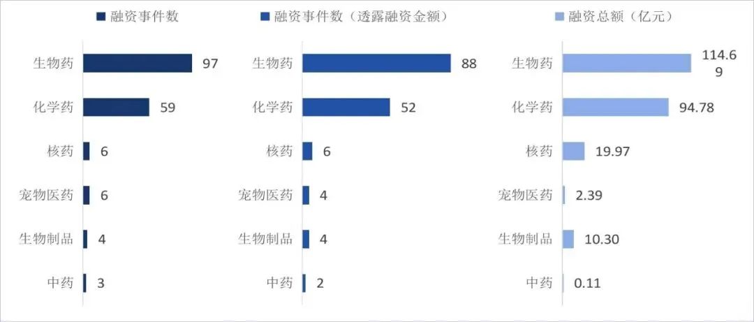 相较之下,医药领域融资总额远超医疗器械领域。尽管医药领域的融资事件数略低于器械领域,但其242.23亿元融资总额达到医疗器械领域的2.1倍。具体而言,医药领域的融资主要聚焦于生物药和化学药两大领域。其中,生物药领域表现尤为突出,融资次数和融资总额分别占比55.4%和47.3%,成为资本热点。
