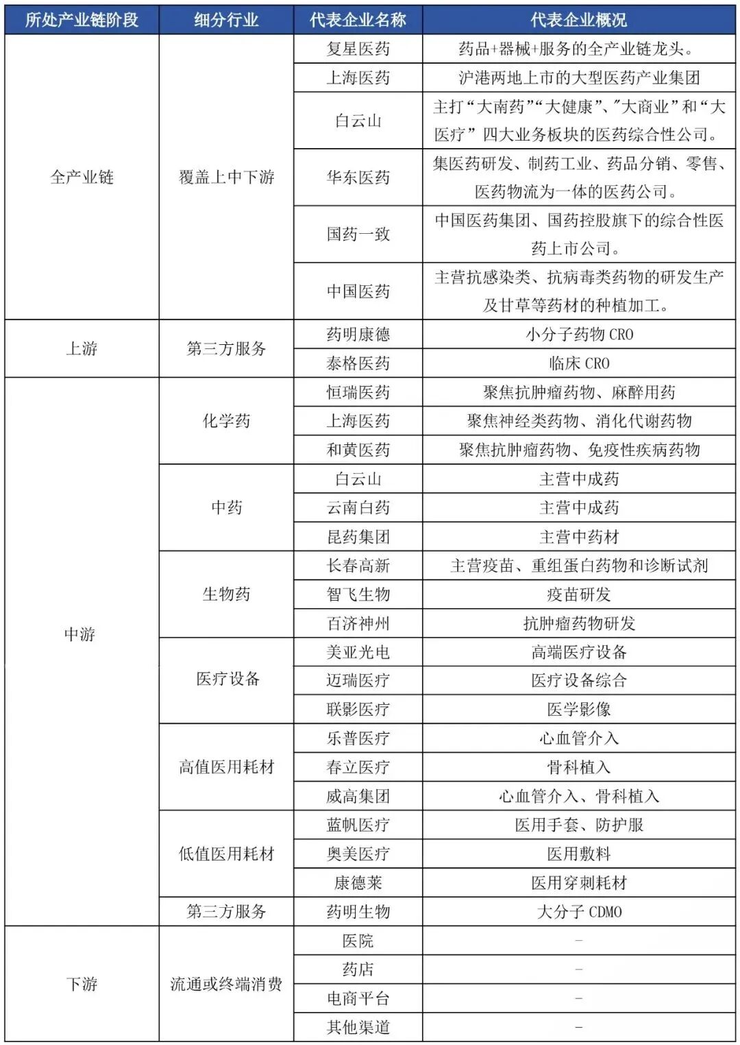 此外,全产业链企业如复星医药、上海医药和华东医药,通过整合关键价值节点实现技术与市场的双轮驱动,实现医药健康产业上中下游领域全覆盖。