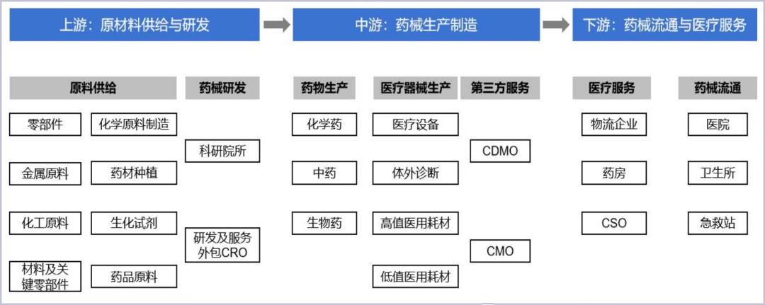 医药健康产业链由上游(原材料供给与研发)、中游(药械生产制造)、下游(药械流通与医疗服务)三个环节构成。